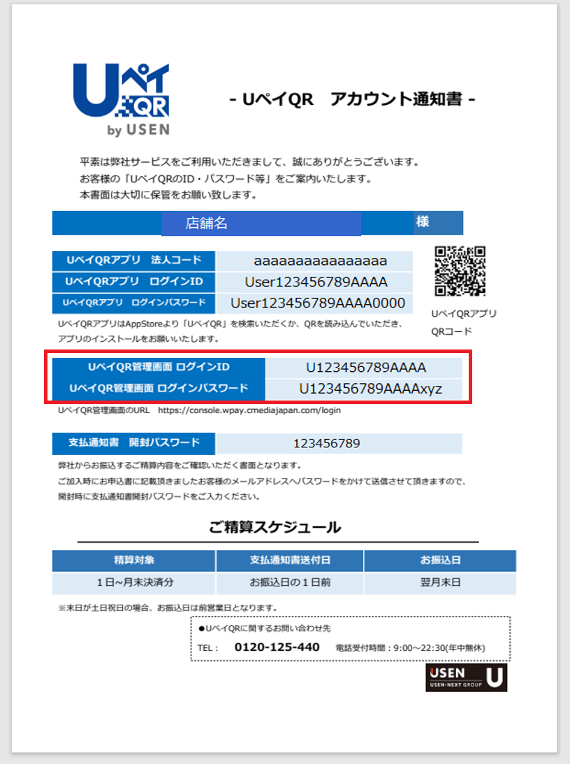 USEN PAY QR(旧:UペイQR)アカウント通知書のログインID、ログインパスワードで再度入力してログインしてください。