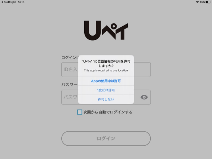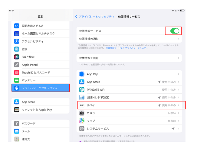 QUSEN PAY ENTRYで、位置情報エラーと表示され決済ができない。最終更新:2025-09-24 00:00:00 USEN PAY(iOS版)では、位置情報を許可する設定でないと位置情報が取得できず、決済エラーになります。以下の手順でご対応ください。位置情報自体をオフにしている場合は、 設定>プライバシーとセキュリティ>位置情報サービス>オンに変更し、 「Uペイ」の位置情報を「このAppの使用中のみ許可」にチェックしてください。 この記事は役立ちましたか?はいいいえ