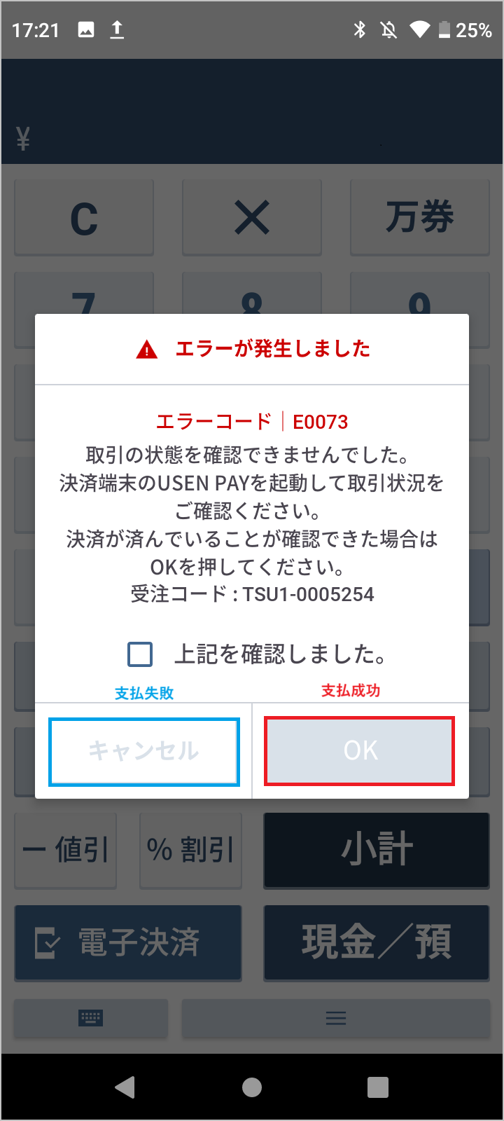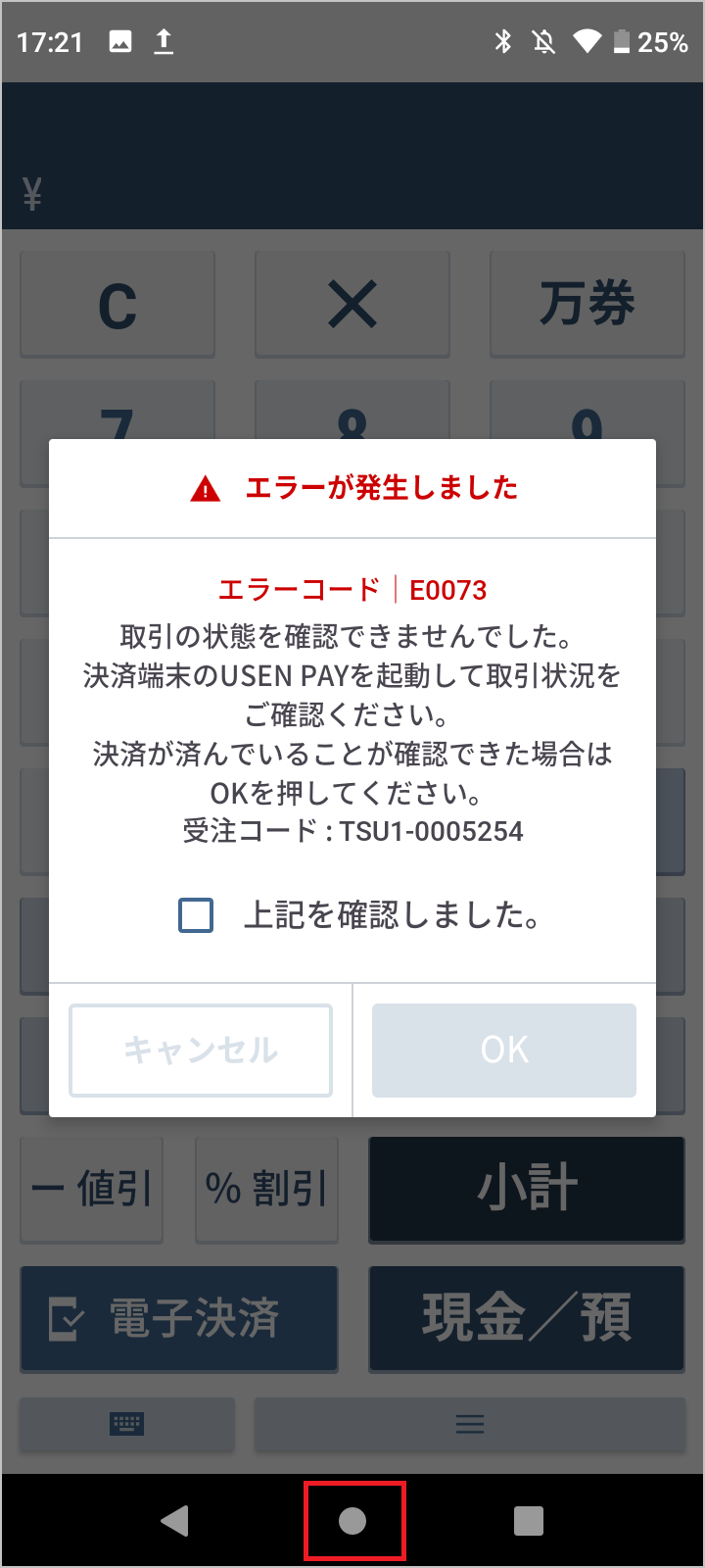 ②会計画面に戻りエラーコードが表示されるため、画面下部の〇ボタンでUSEN PAYアプリに戻ります。
