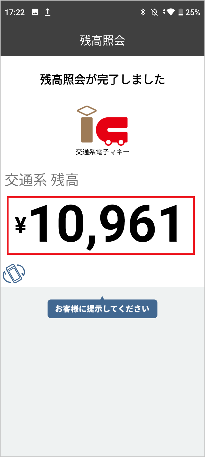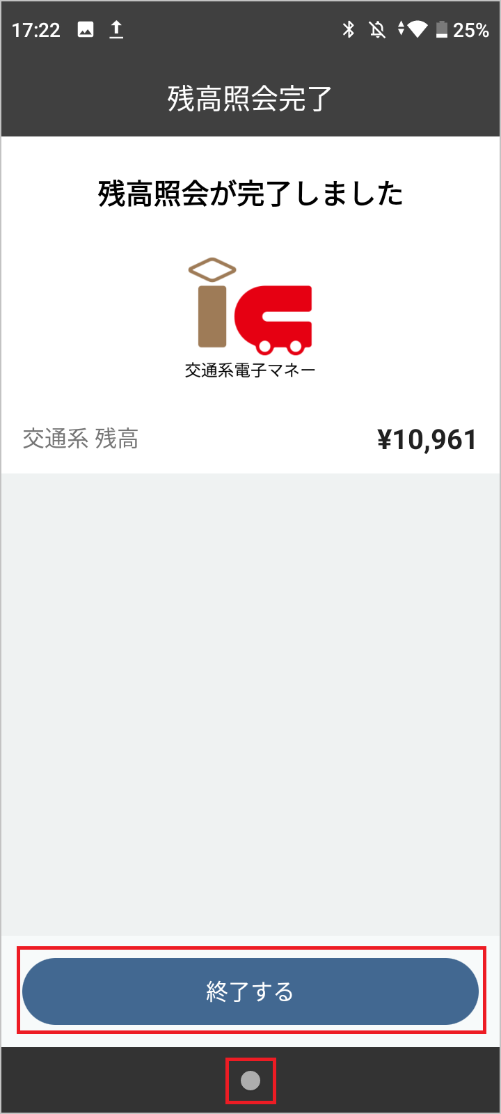 ⑥残高照会の完了後、「終了する」を押下し、画面下部の〇ボタンで会計画面に戻ります。