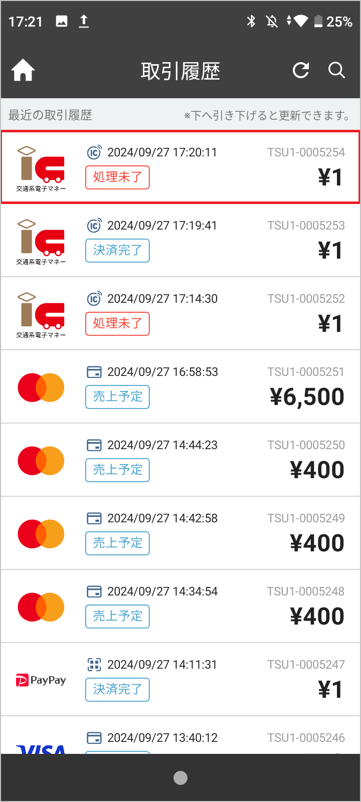 ③USEN PAYホーム画面 > 履歴より、処理未了の決済情報を押下します。