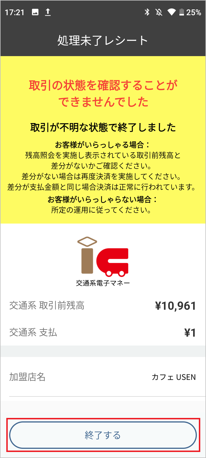 QUSEN PAY+にて、電子マネー決済中に処理未了になった。