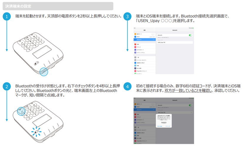 →決済端末の電源がONになっている場合、決済端末のボタンを5秒以上長押しすると、決済端末の画面左上のBluetoothマークが点滅するので、点滅したらボタンを離します。