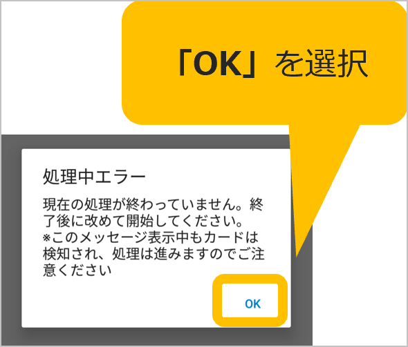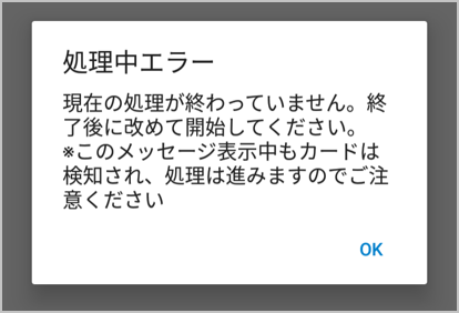 処理中エラーは、USEN PAYが別の取引を実行中画面でUSENレジから会計の連動があった場合に発生する画面です。