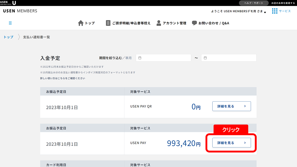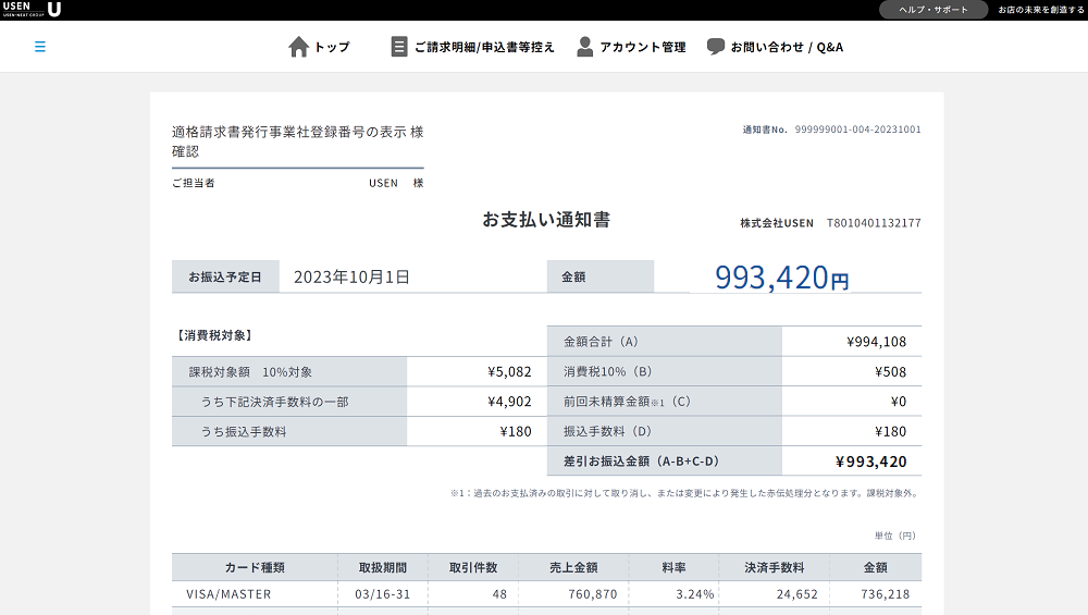 QUSEN PAY / USEN PAY ENTRY / USEN PAY QRの支払通知書(売上精算)をUSEN MEMBERSで閲覧したい。