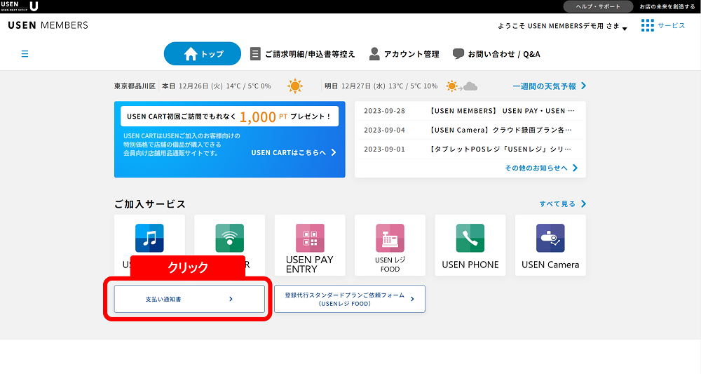 お客様専用マイページ「USEN MEMBERS」で支払い通知書を確認できます。