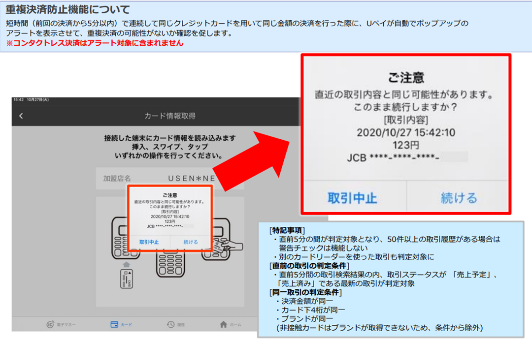 QUSEN PAY・USEN PAY ENTRYの二重決済(重複決済)防止アラートについて知りたい。