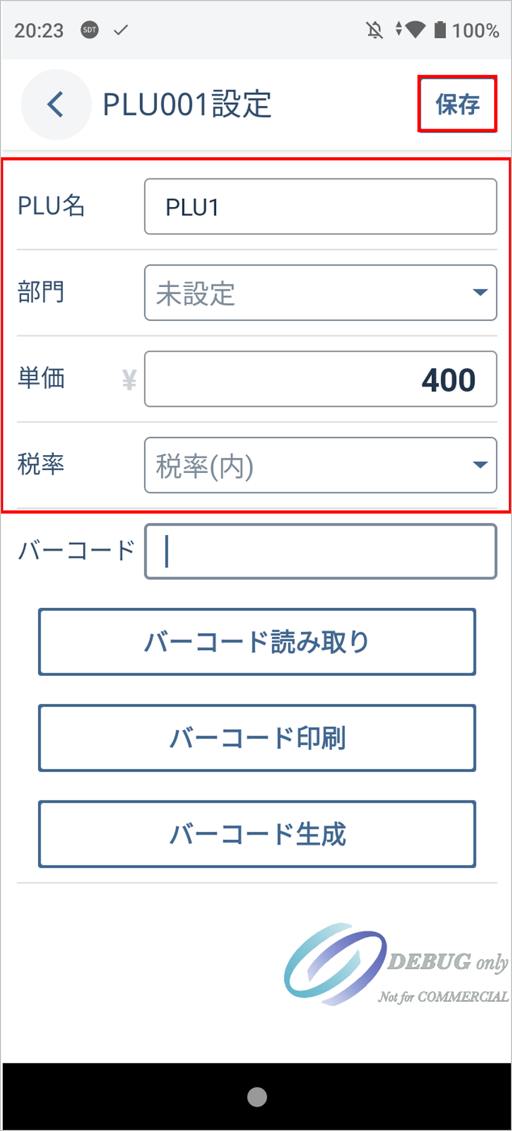 ③選択したPLU番号の設定画面に遷移後、PLU名・部門・単価・税率を入力します。