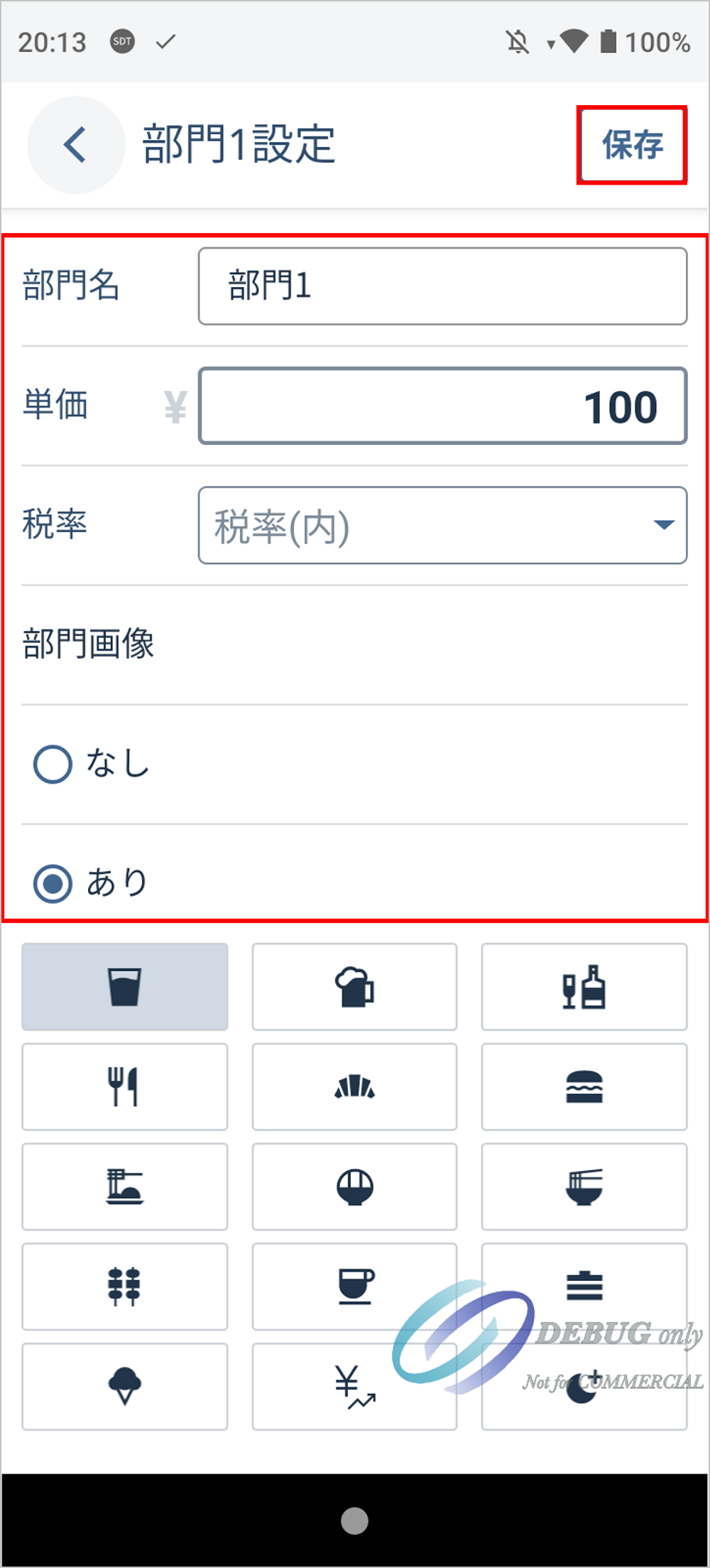 ③選択した部門番号の設定画面に遷移後、部門名・単価・税率・画像有無を入力します。