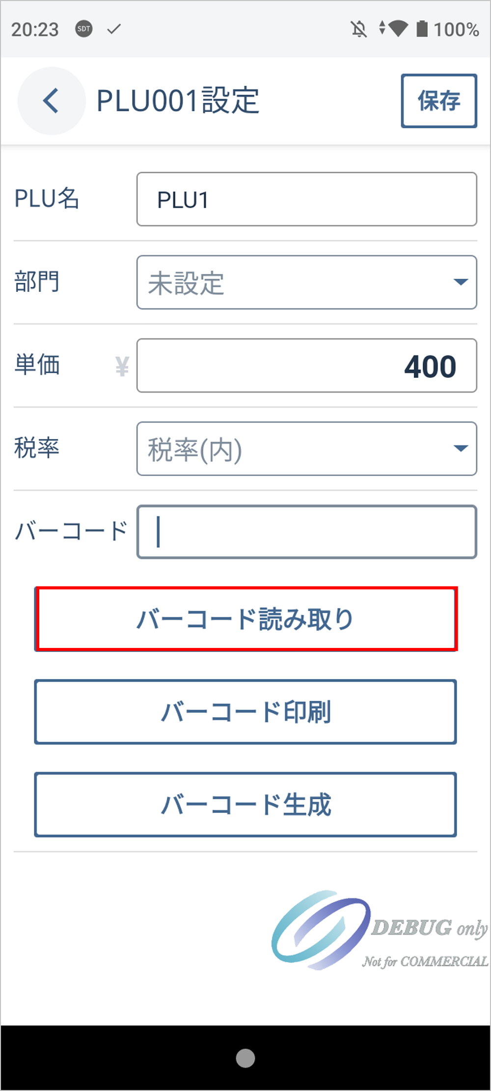 ①PLU設定画面より「バーコード読み取り」を押下します。