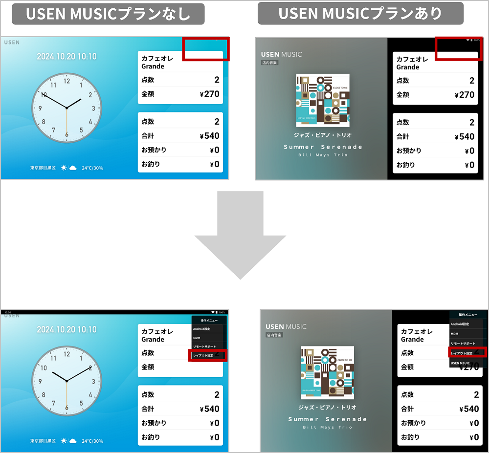 QUSEN PAY+にて、カスタマーディスプレイのレイアウトを変更したい。最終更新:2025-09-24 00:00:00 ①カスタマーディスプレイホーム画面より、右上をダブルタップしてください。②操作メニューが表示されるので「レイアウト設定」を選択してください。【レイアウト設定画面の各項目説明】USEN PAY+カスタマーディスプレイ操作マニュアルのレイアウト設定ページをご確認ください。 この記事は役立ちましたか?はいいいえ
