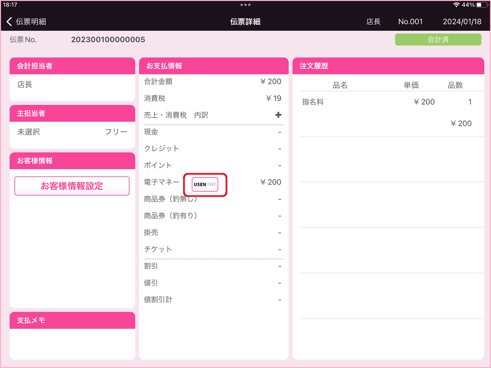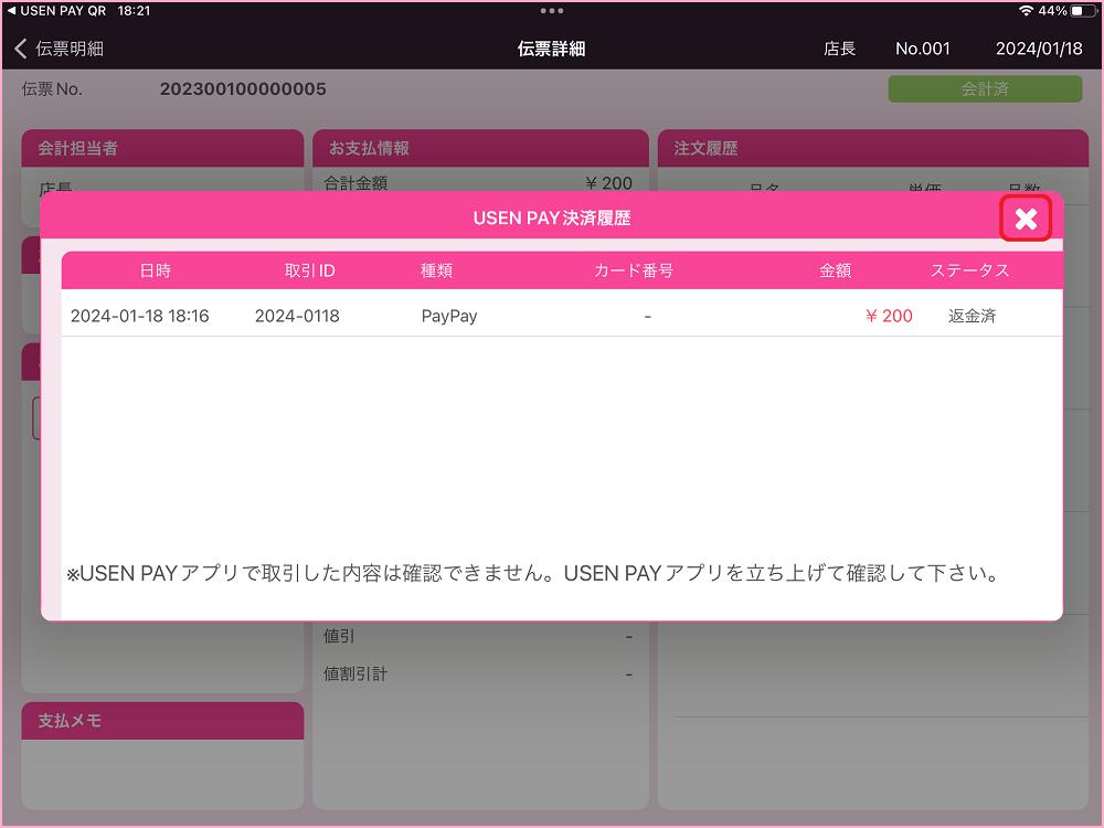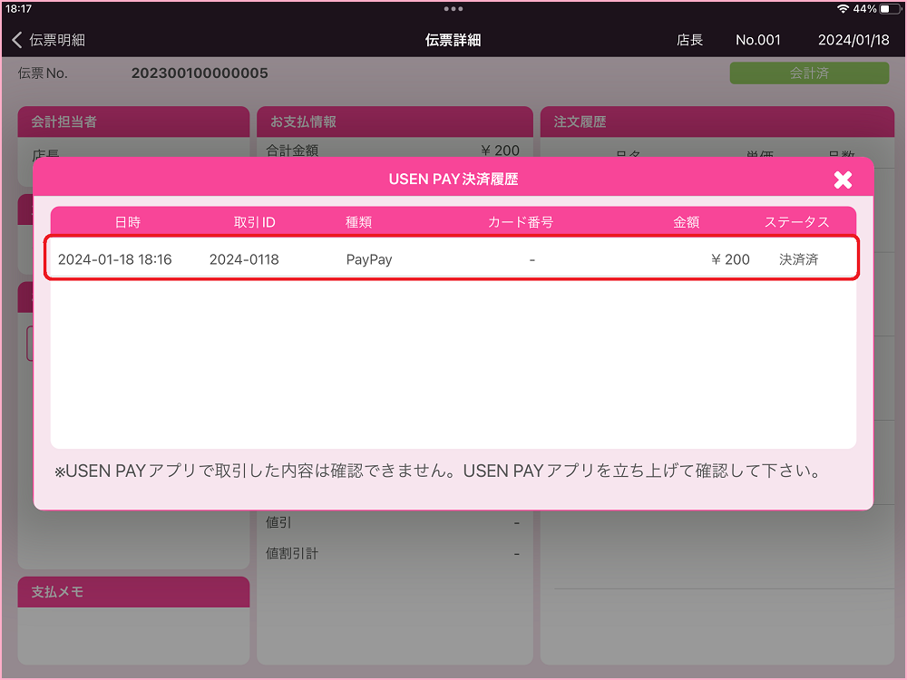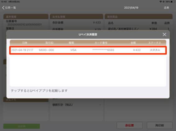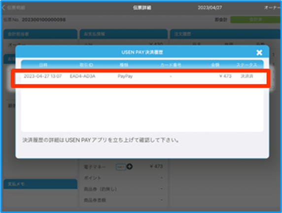 3.伝票詳細の『USEN PAY』をタップします。