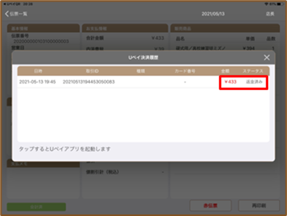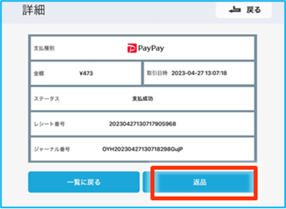 10.取消した取引の金額とステータスが『返品済み』に変わっていることを確認し、