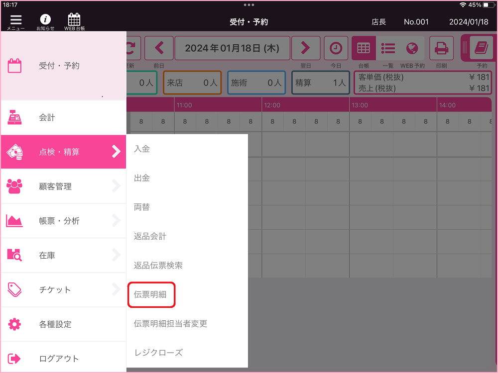 1.『点検・精算>伝票明細』をタップしてください。