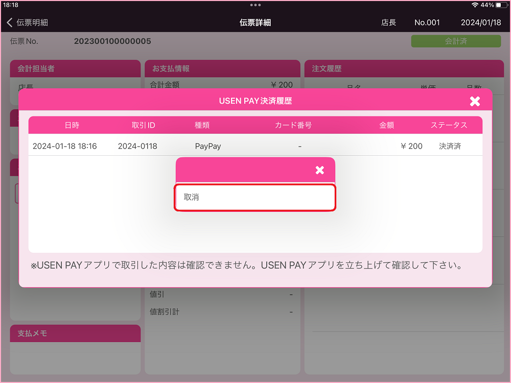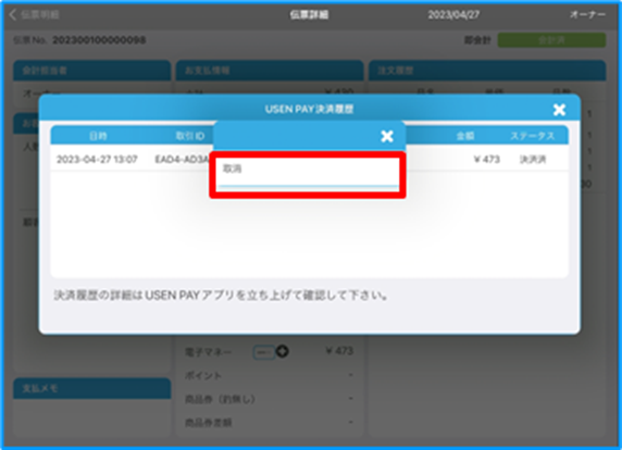 USENレジ連携したQRコード決済はUSENレジから取消作業が可能です。