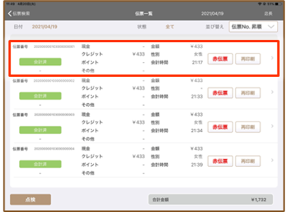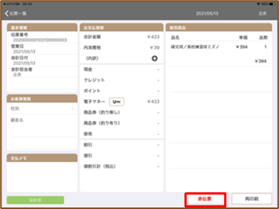 8.USENレジアプリの『伝票明細』画面に戻り、該当の明細で『赤伝票』をタップして赤伝票を発行します。