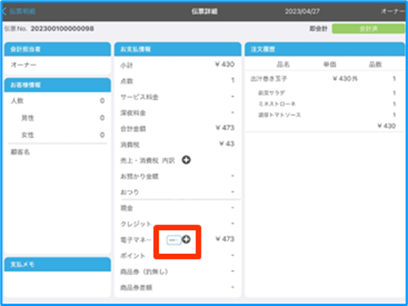 4.伝票詳細電子マネー欄の『□』アイコンをタップします。
