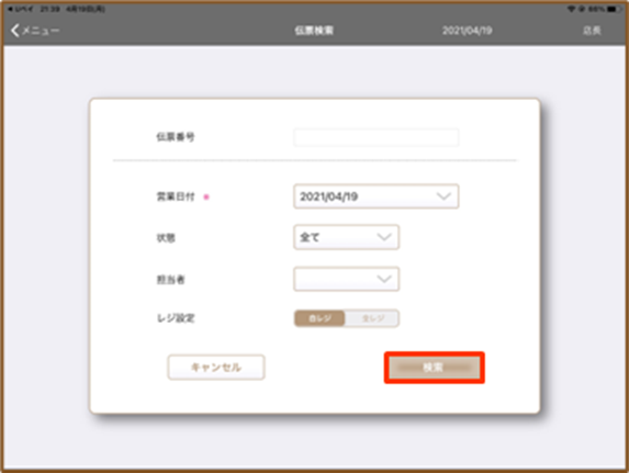 2.伝票検索画面で取消対象の検索条件を入力して『検索』をタップしてください。