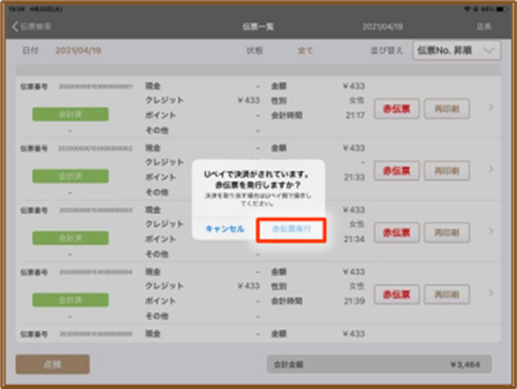 10.USENレジアプリの『伝票明細』画面に戻り、該当の明細で『赤伝票』をタップして赤伝票を発行します。