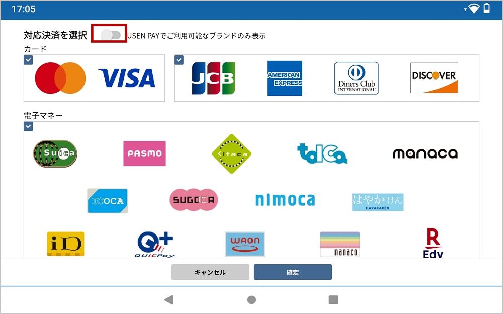 USEN PAY+の審査情報反映を切りたい場合は、レイアウト設定画面の「USEN PAYでご利用可能なブランドのみ表示」をオフにしてください。