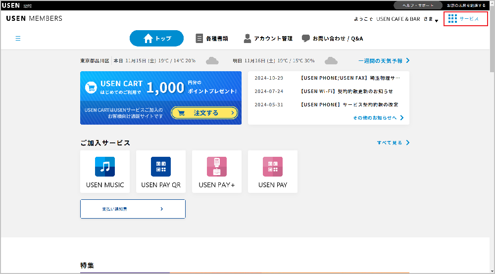 ①USEN MEMBERSにログイン後、トップページより「サービス」を押下します。