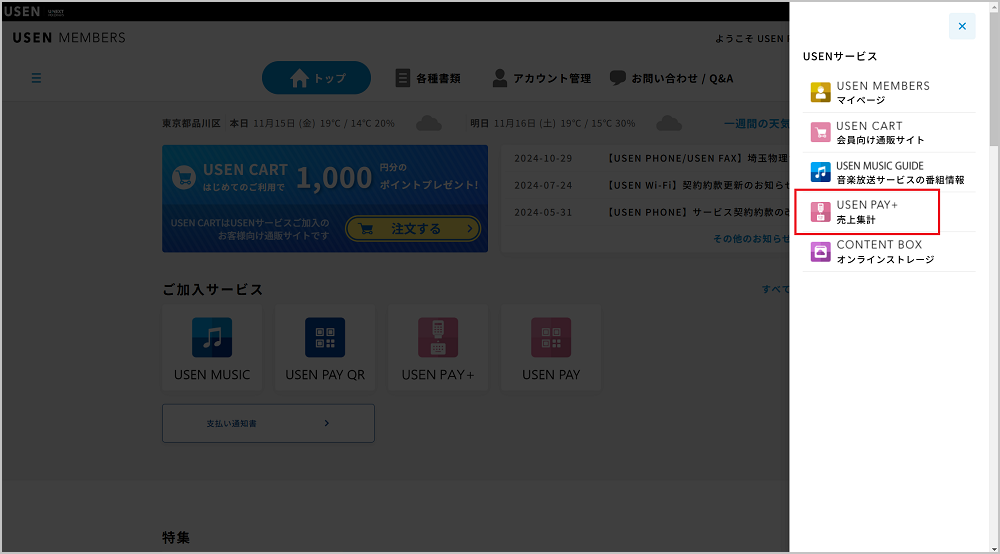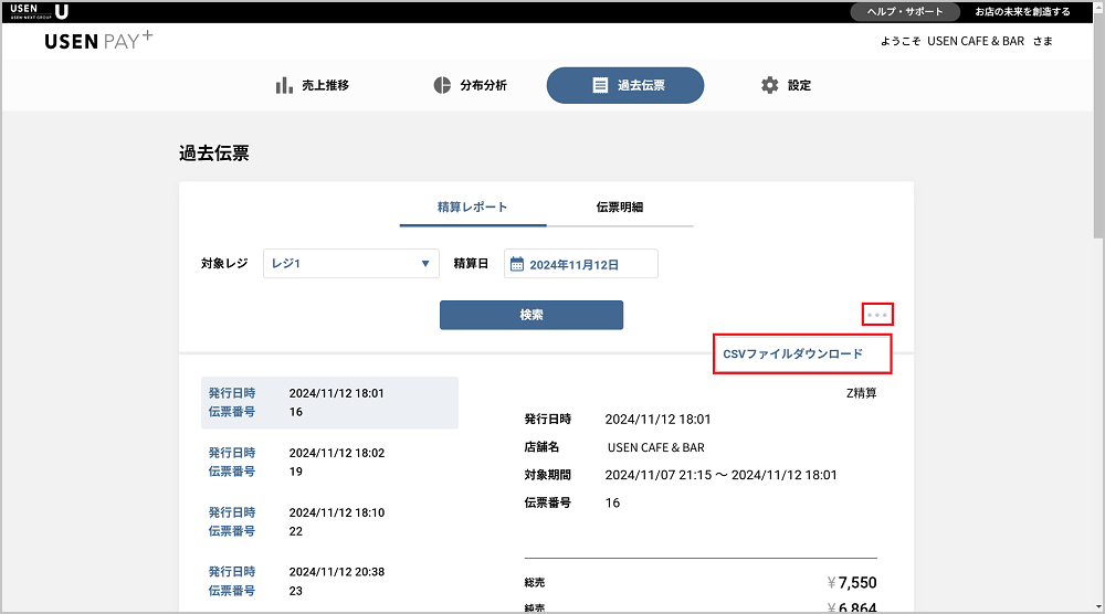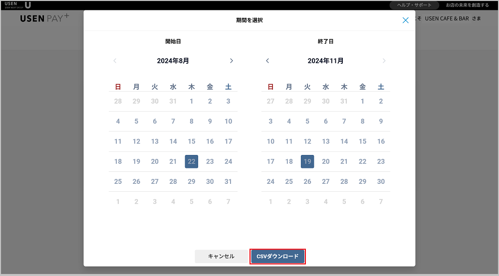 以下の手順に沿って、USEN MEMBERSより精算レポートをCSVで出力ください。