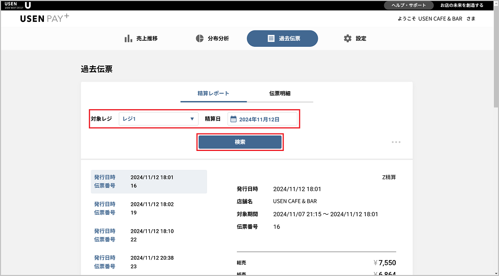 ④過去伝票画面に遷移後、「対象レジ」と「精算日」を選択して「検索」を押下すると、下部に検索した条件の精算レポートが表示されます。