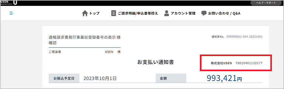 QUSEN PAYシリーズの支払通知書が、インボイス対応しているかどこで判断できるか。最終更新:2025-09-24 00:00:00 「株式会社USEN」の横に適格請求書発行事業者登録番号(T+法人番号)が出力された支払通知書は、インボイス対応しています。マニュアルはこちらからご確認いただけます。<USEN MEMBERS支払通知書> この記事は役立ちましたか?はいいいえ