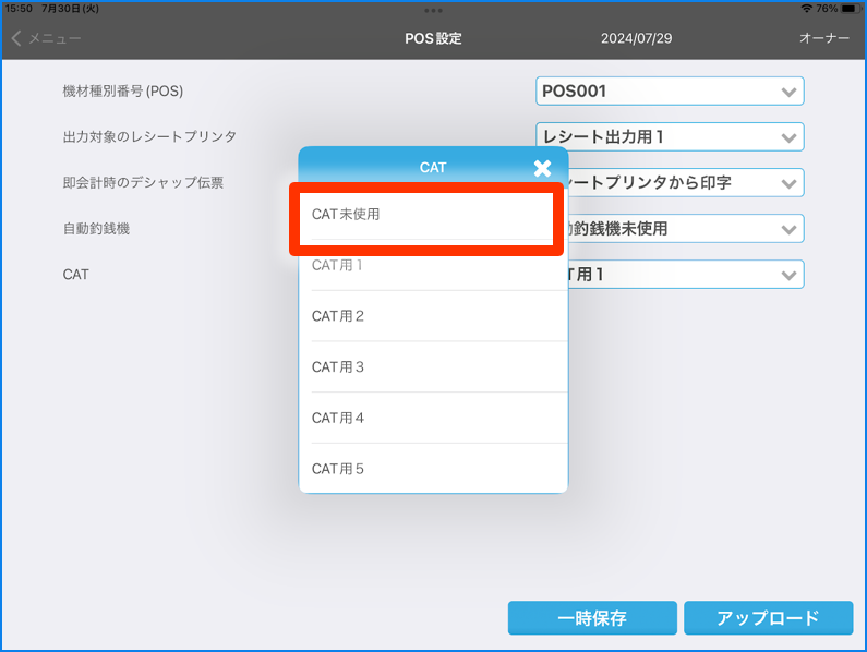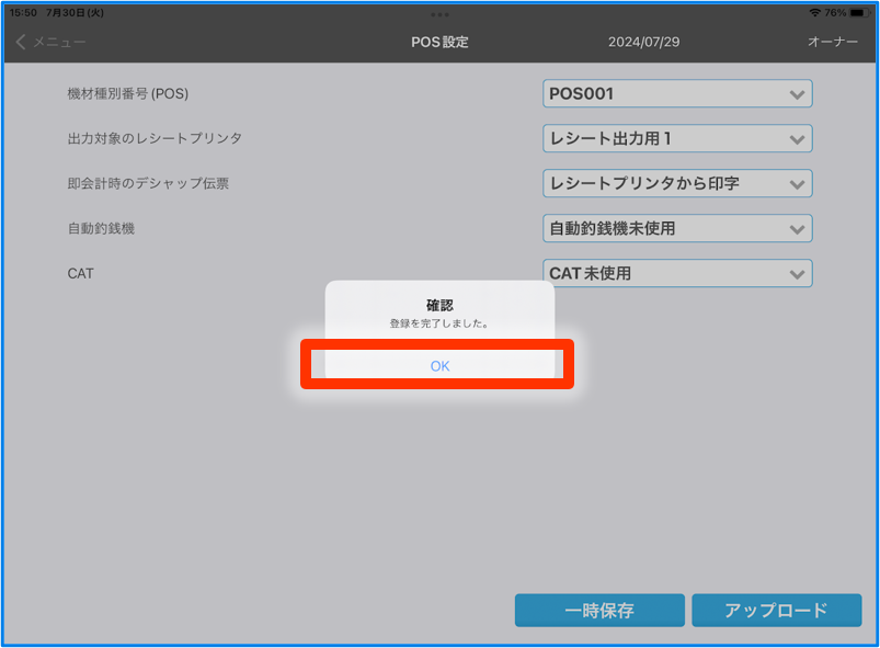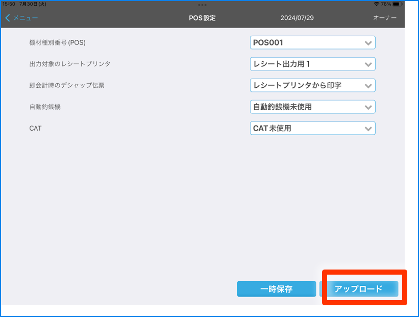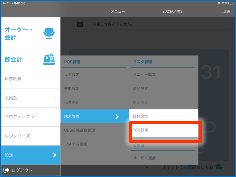 トップメニューより『設定』>『端末管理』>『POS設定』の順にタップします。